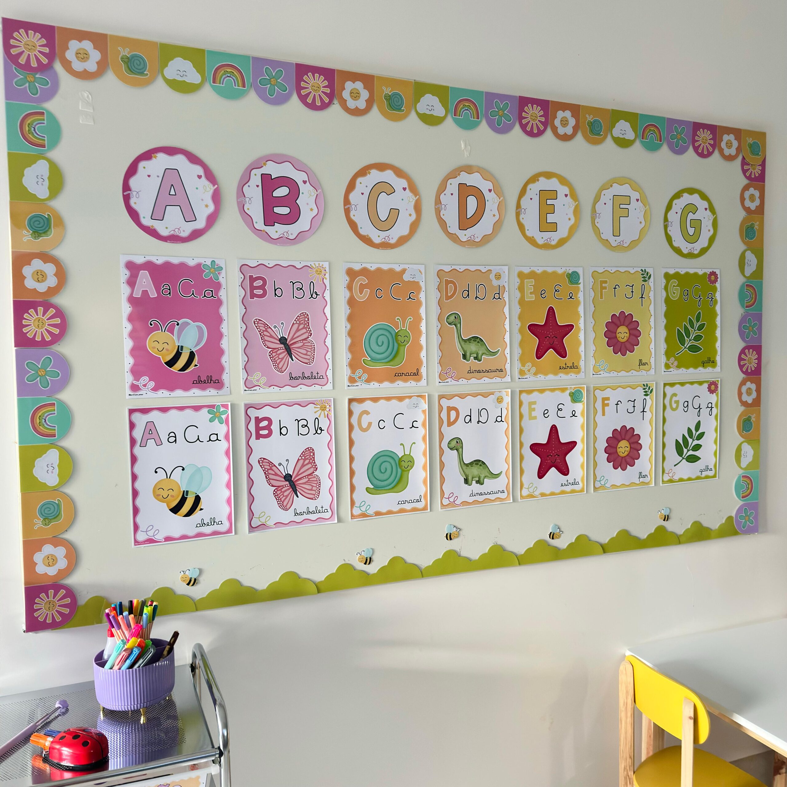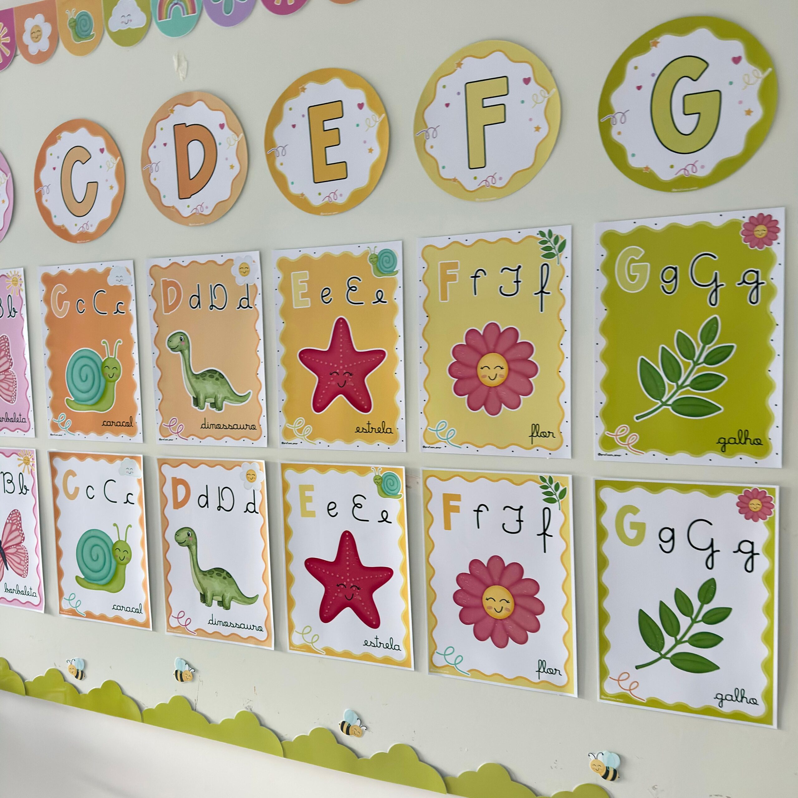 –Alfabeto com quatro tipos de letras: Cursivo maiúsculo e minúsculo e caixa alta maiúsculo e minúsculo.