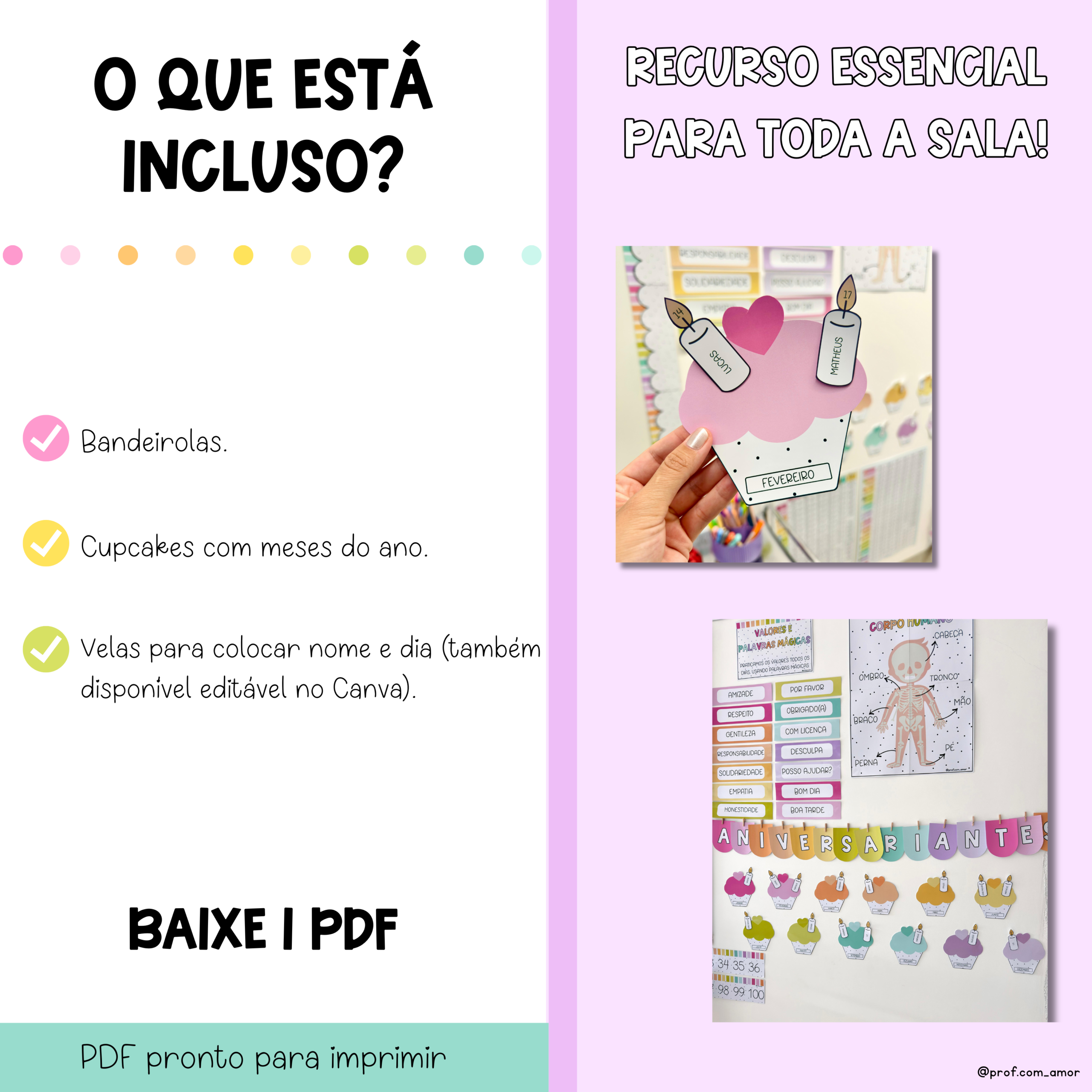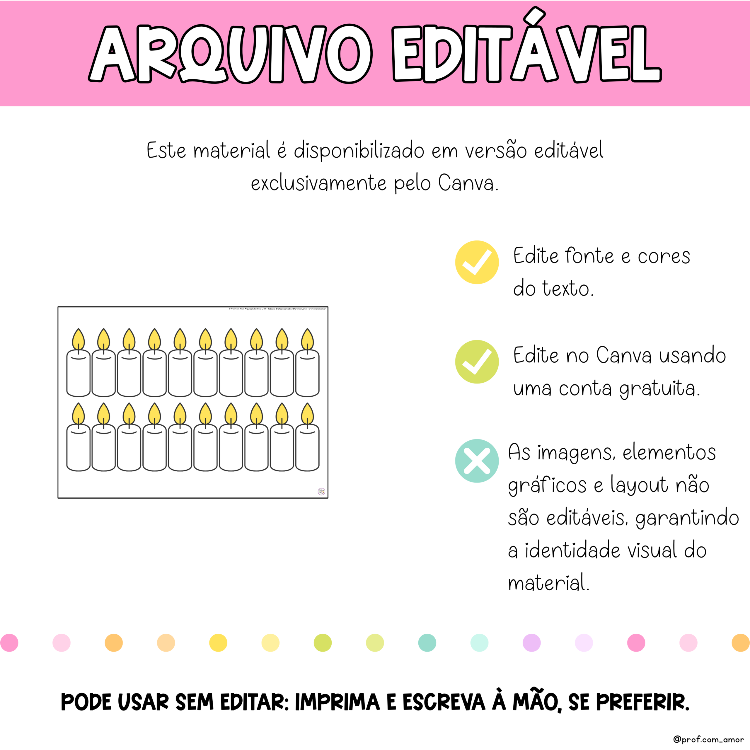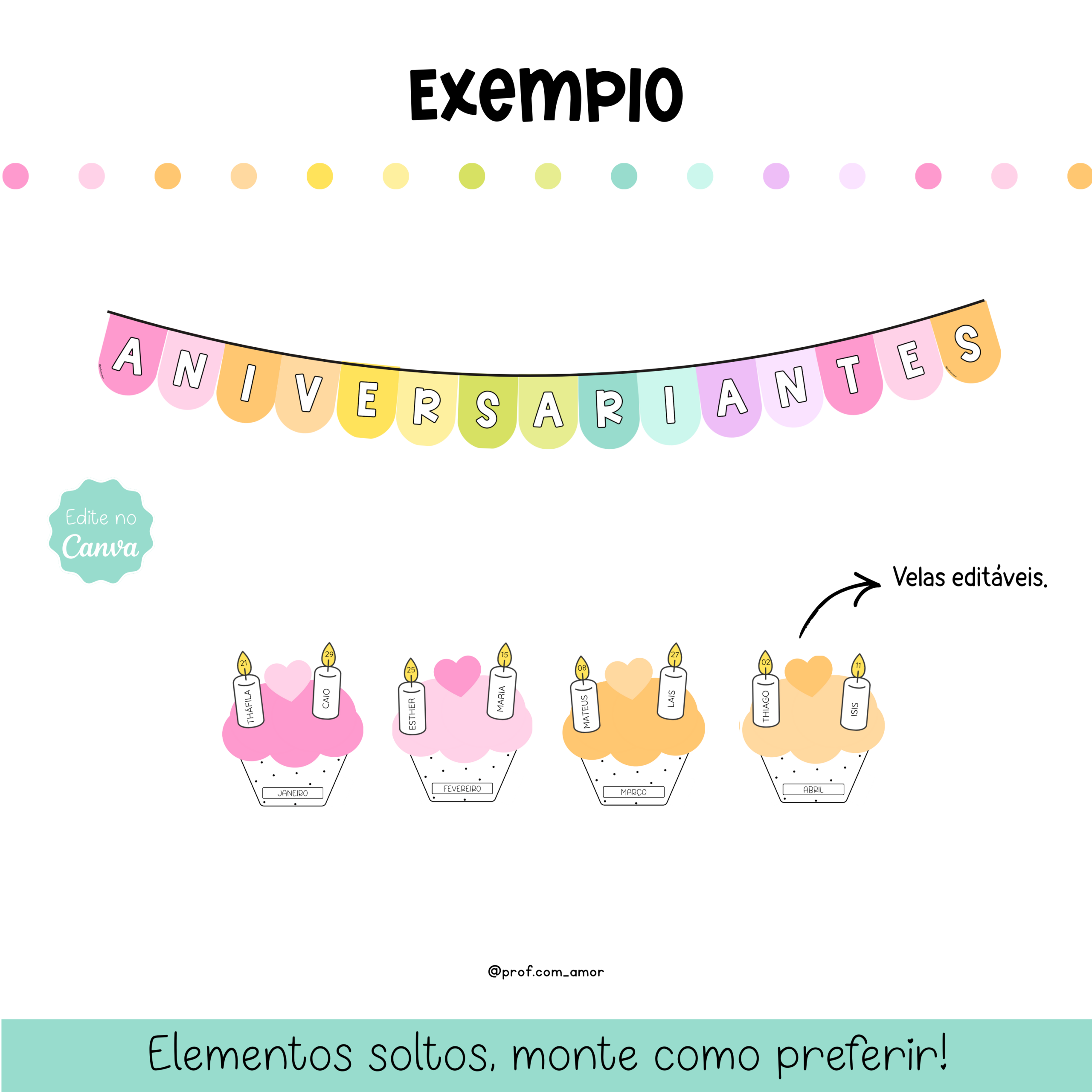 -Velas para colocar nome e dia (também disponível editável no Canva). Será possível editar apenas o texto das velas. As imagens, elementos gráficos e layout não são editáveis, garantindo a identidade visual do material.