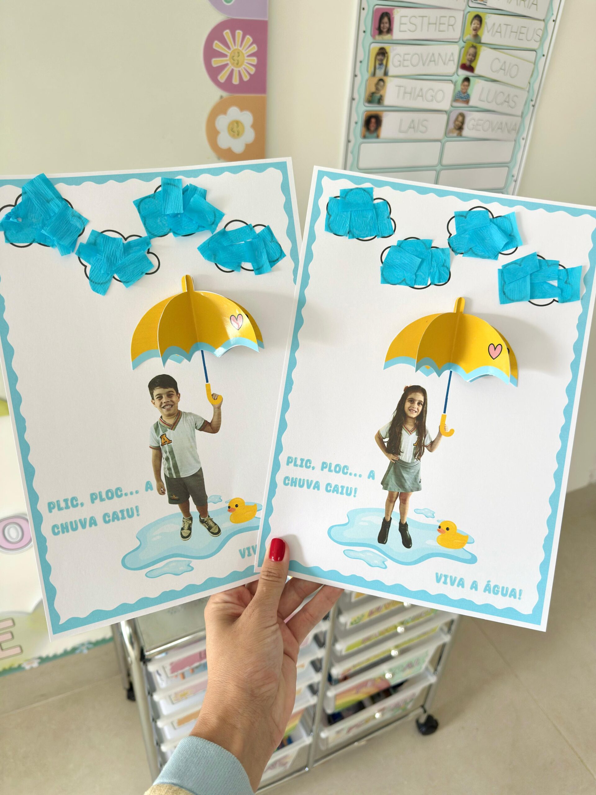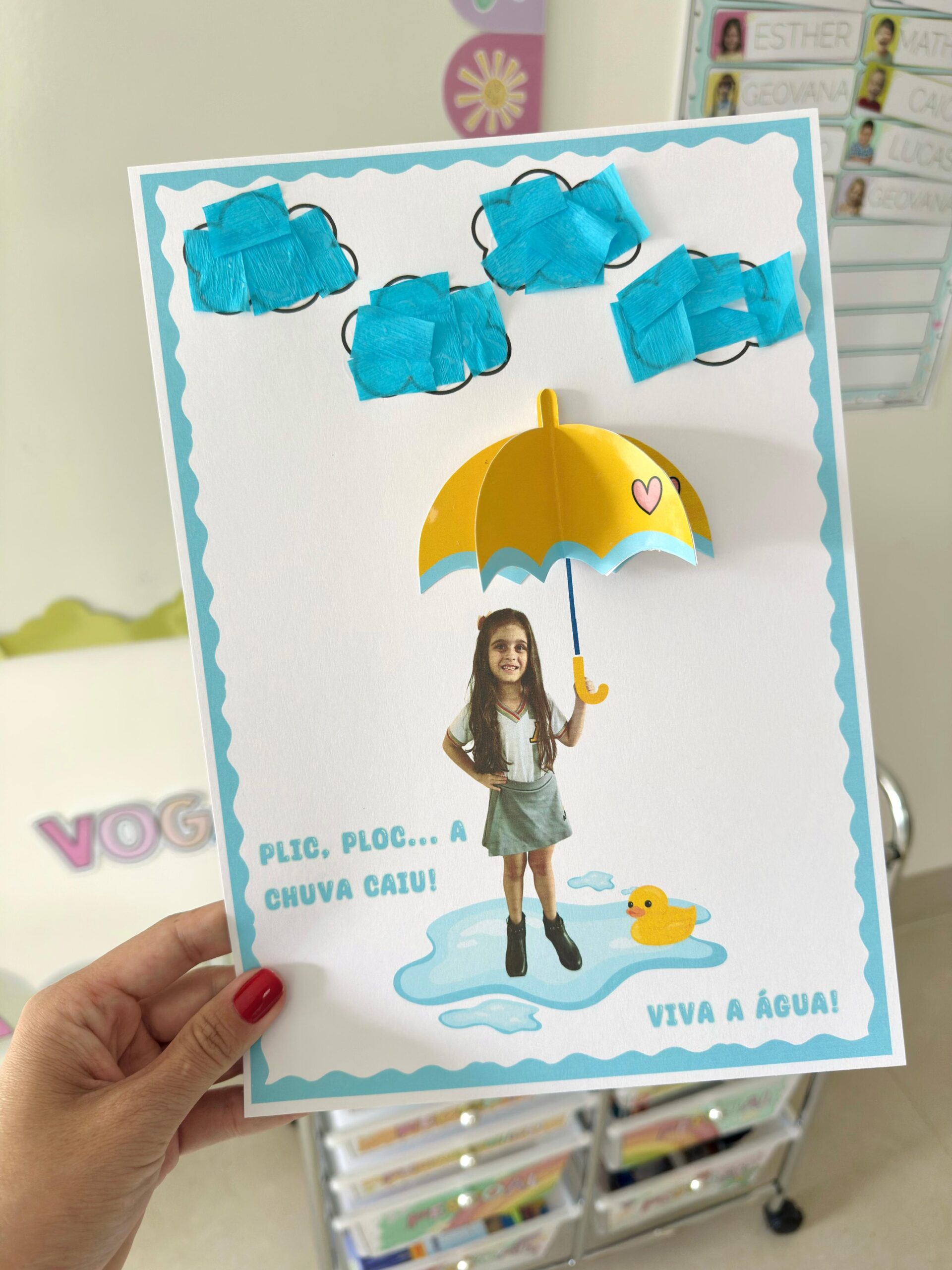 Neste material, a criança participa da experiência da “nuvem que chove”, segura o guarda-chuva na atividade personalizada com foto e vivencia o conceito da chuva de maneira simples e concreta.
