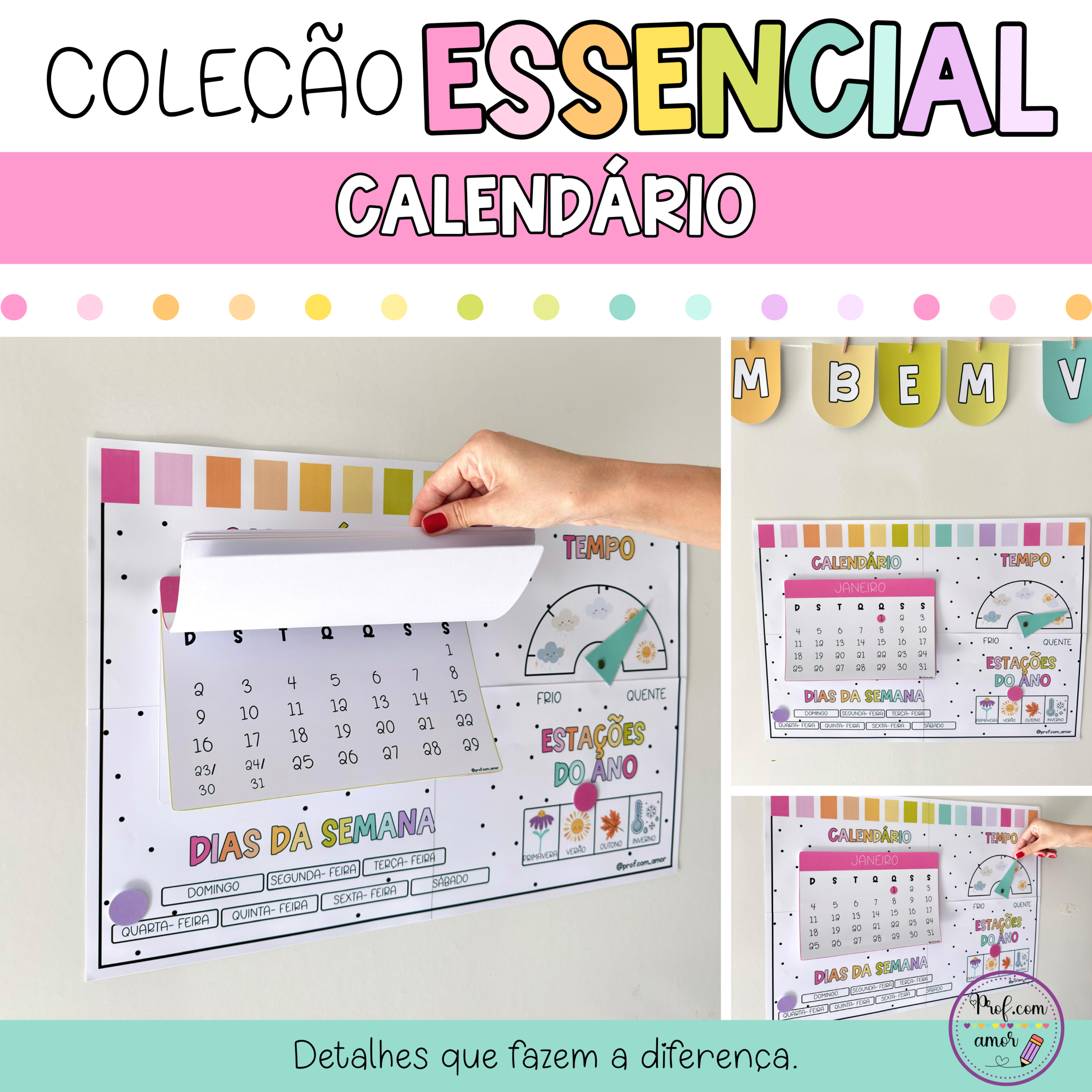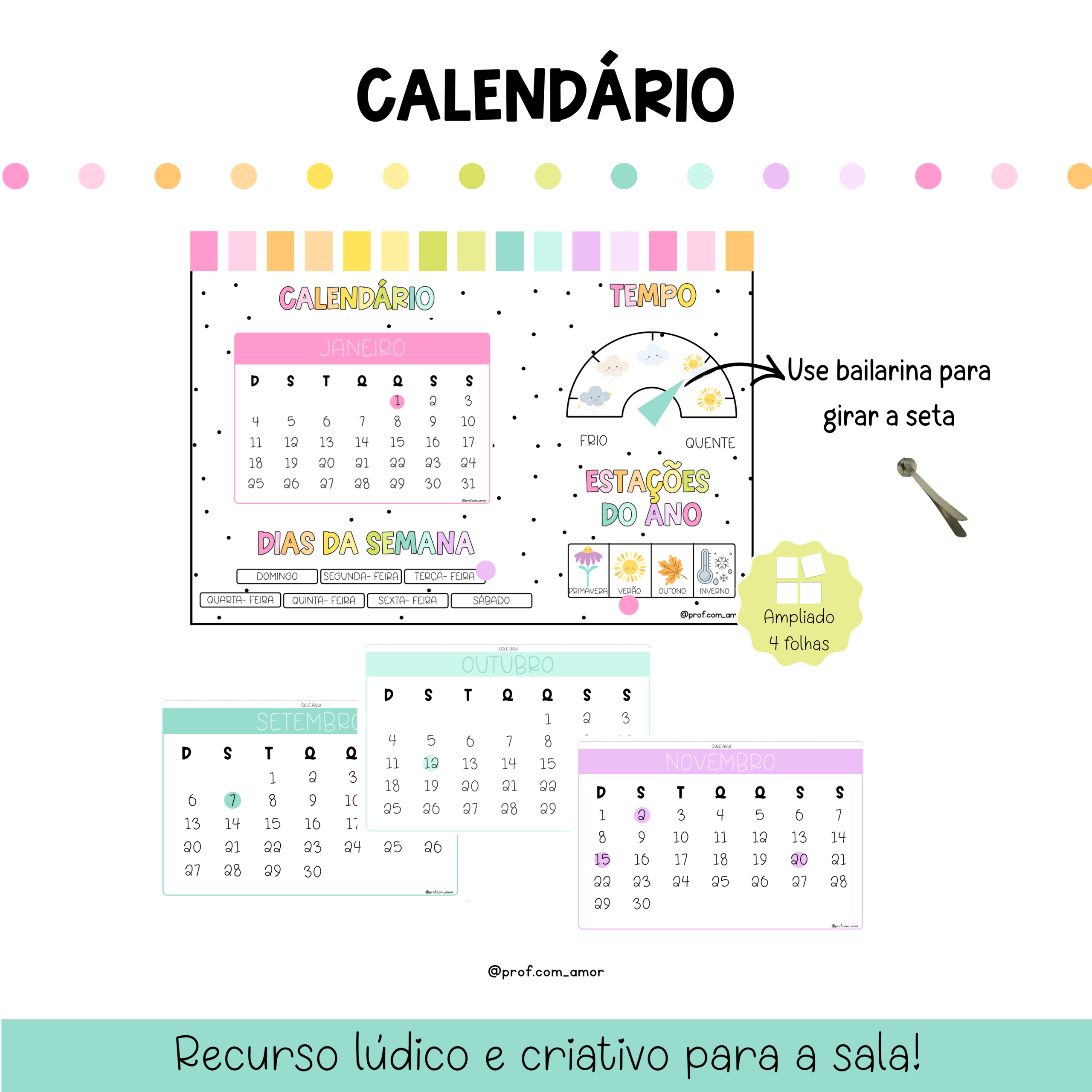Calendário lúdico que organiza a rotina da sala de aula com tempo, estação do ano, dias da semana e folhinhas para datas.
