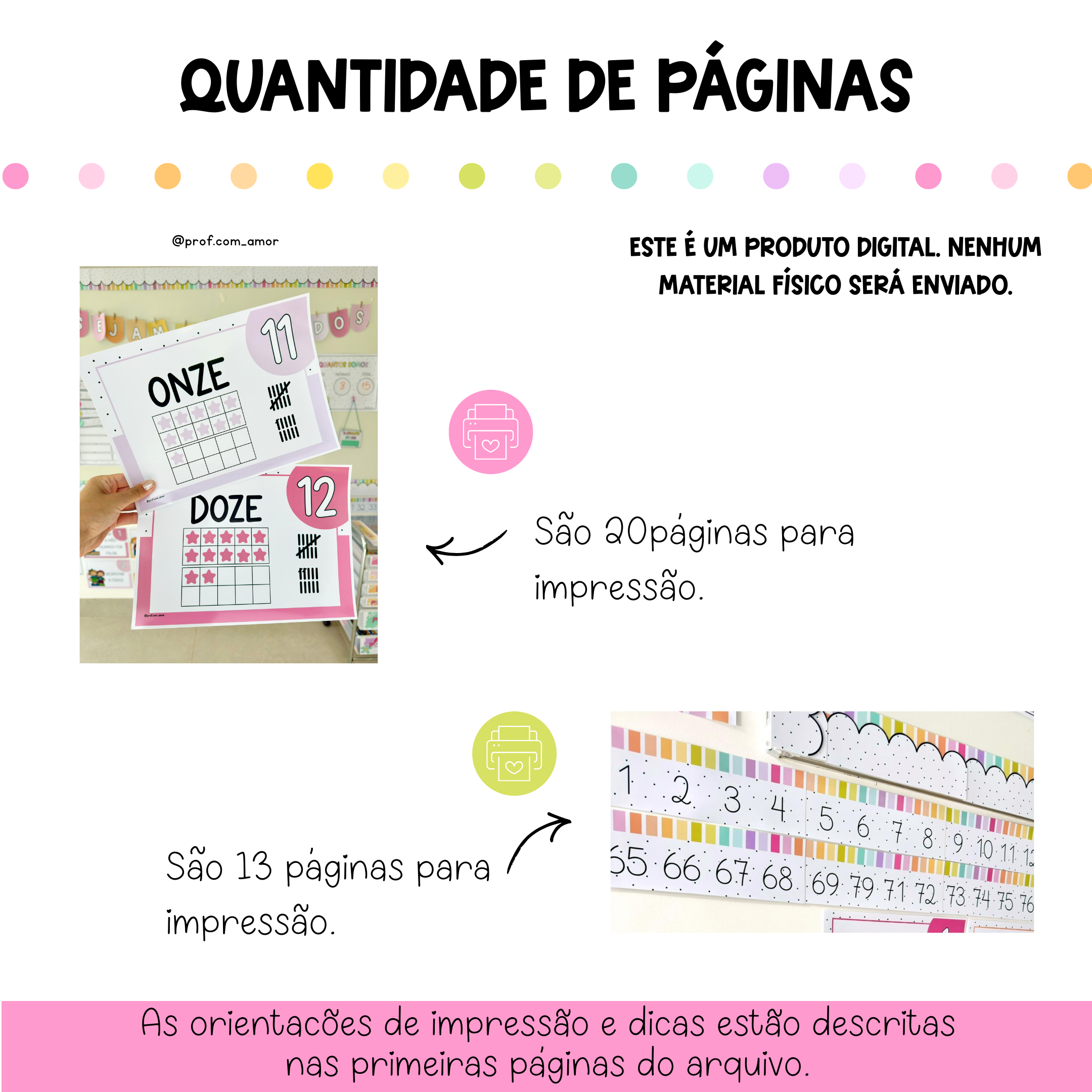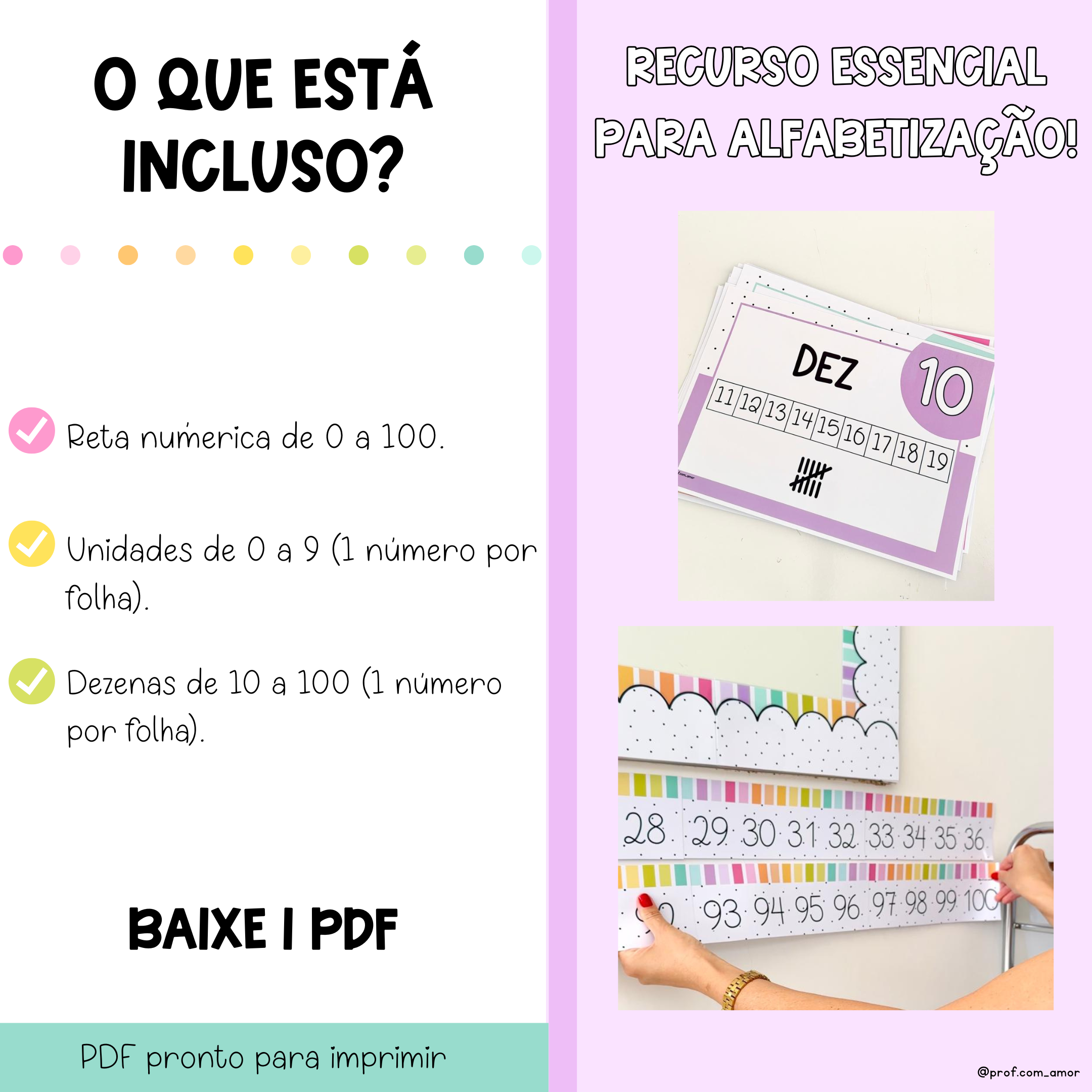 Recurso visual e funcional para trabalhar a sequência numérica, reconhecimento dos números e noção de quantidade de forma clara e organizada. Ideal para apoiar o processo de alfabetização matemática, facilitando a compreensão dos números de 0 a 100 no dia a dia da sala de aula.