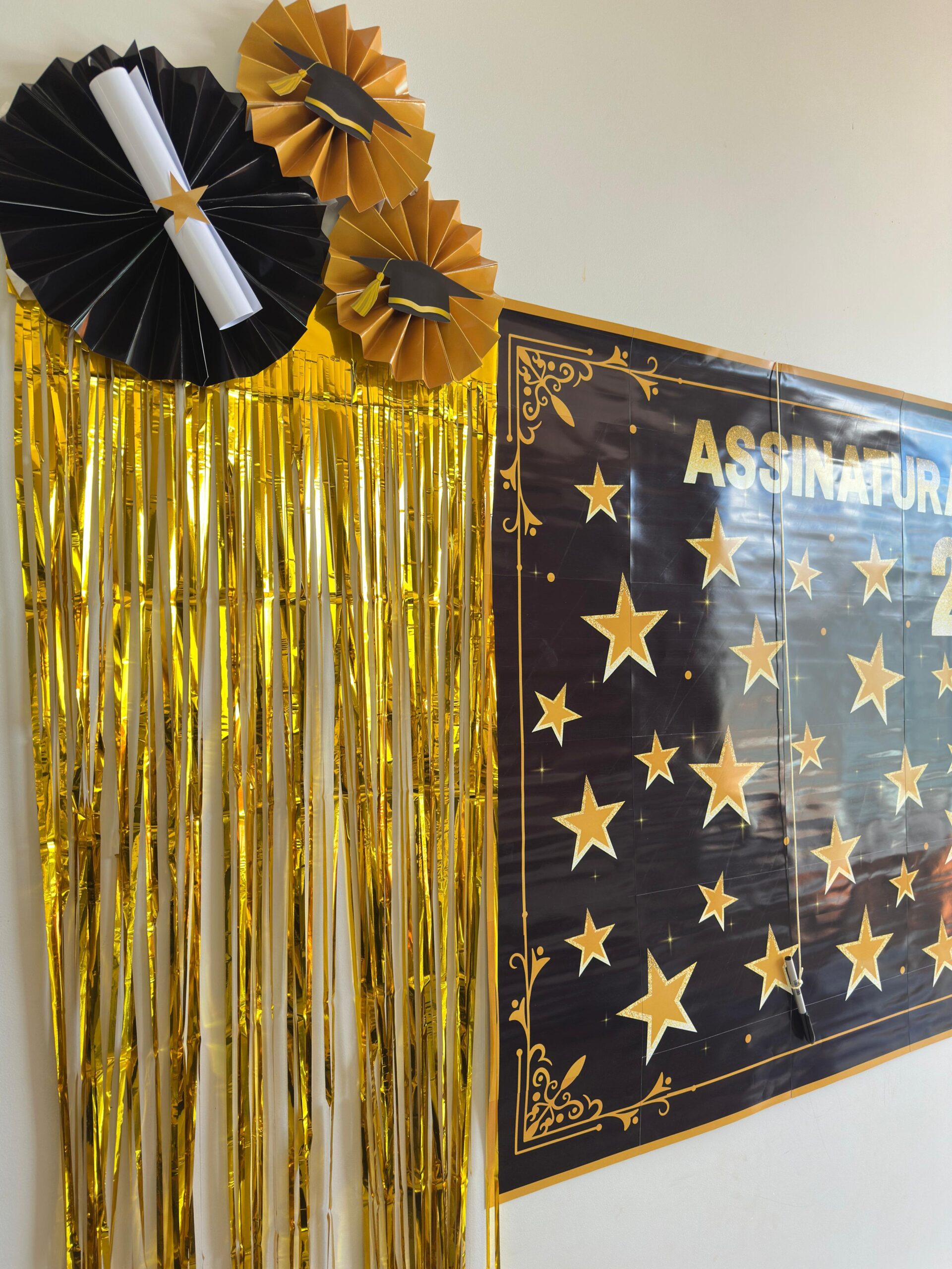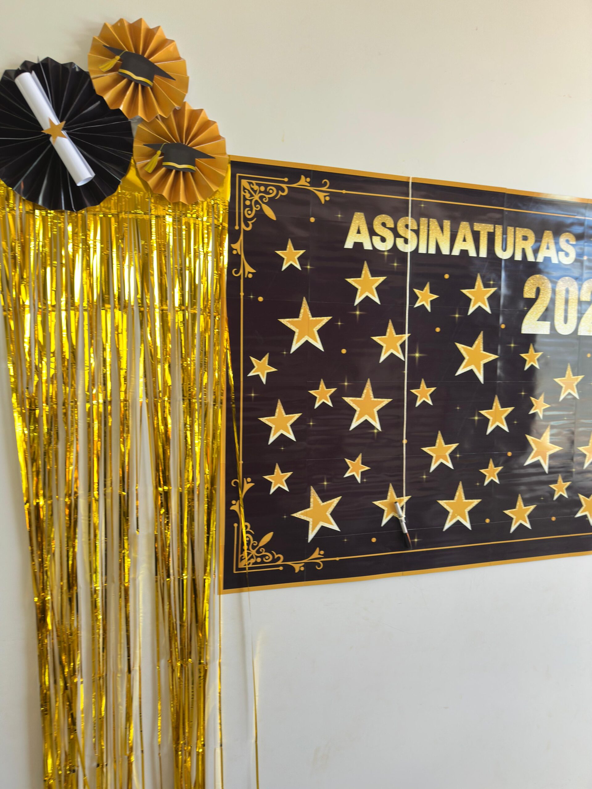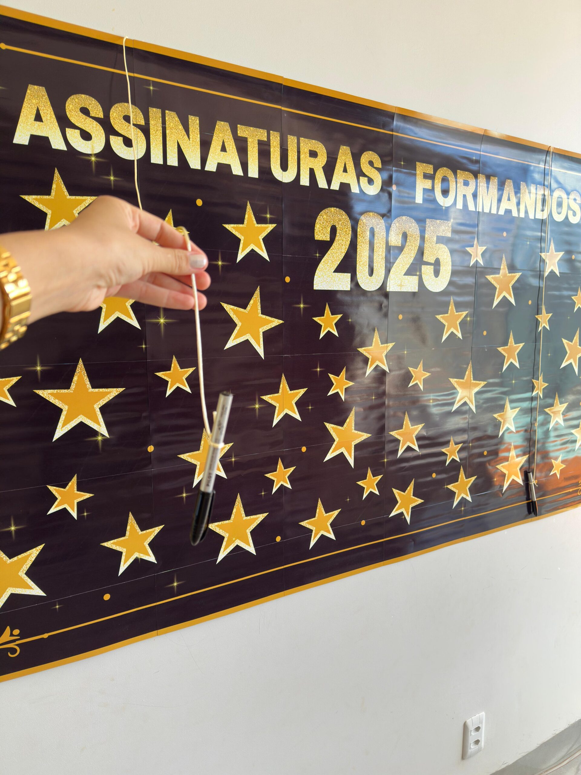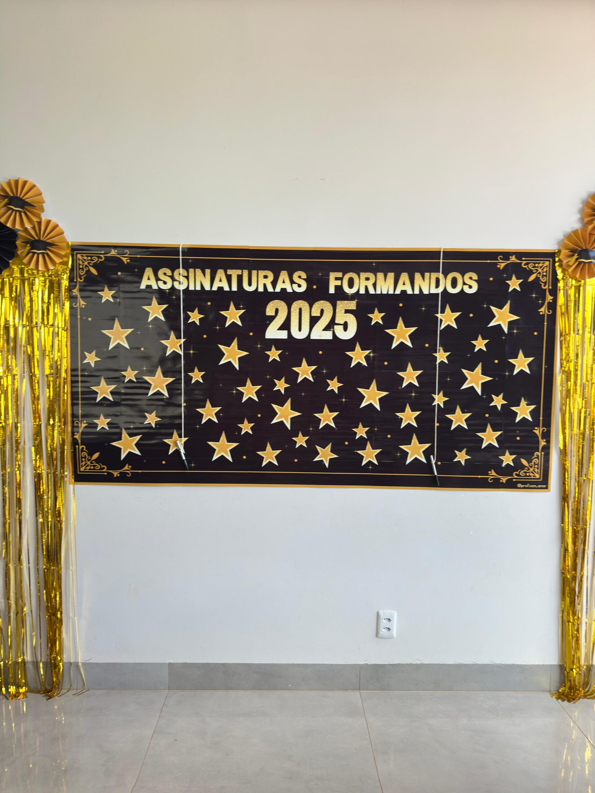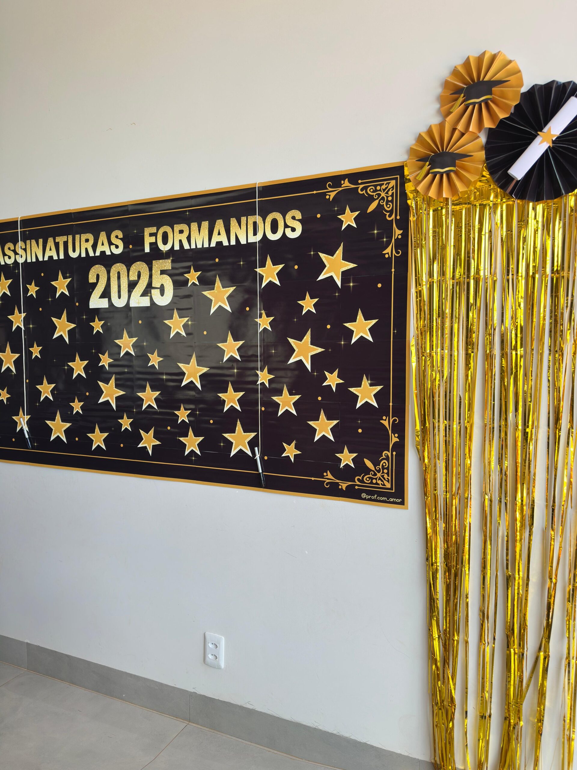 O painel possui fundo preto com estrelas douradas e o título “Assinaturas Formandos 2025”. Na montagem final, utiliza-se cortina dourada nas laterais, deixando o visual mais festivo e adequado para decoração de formaturas.