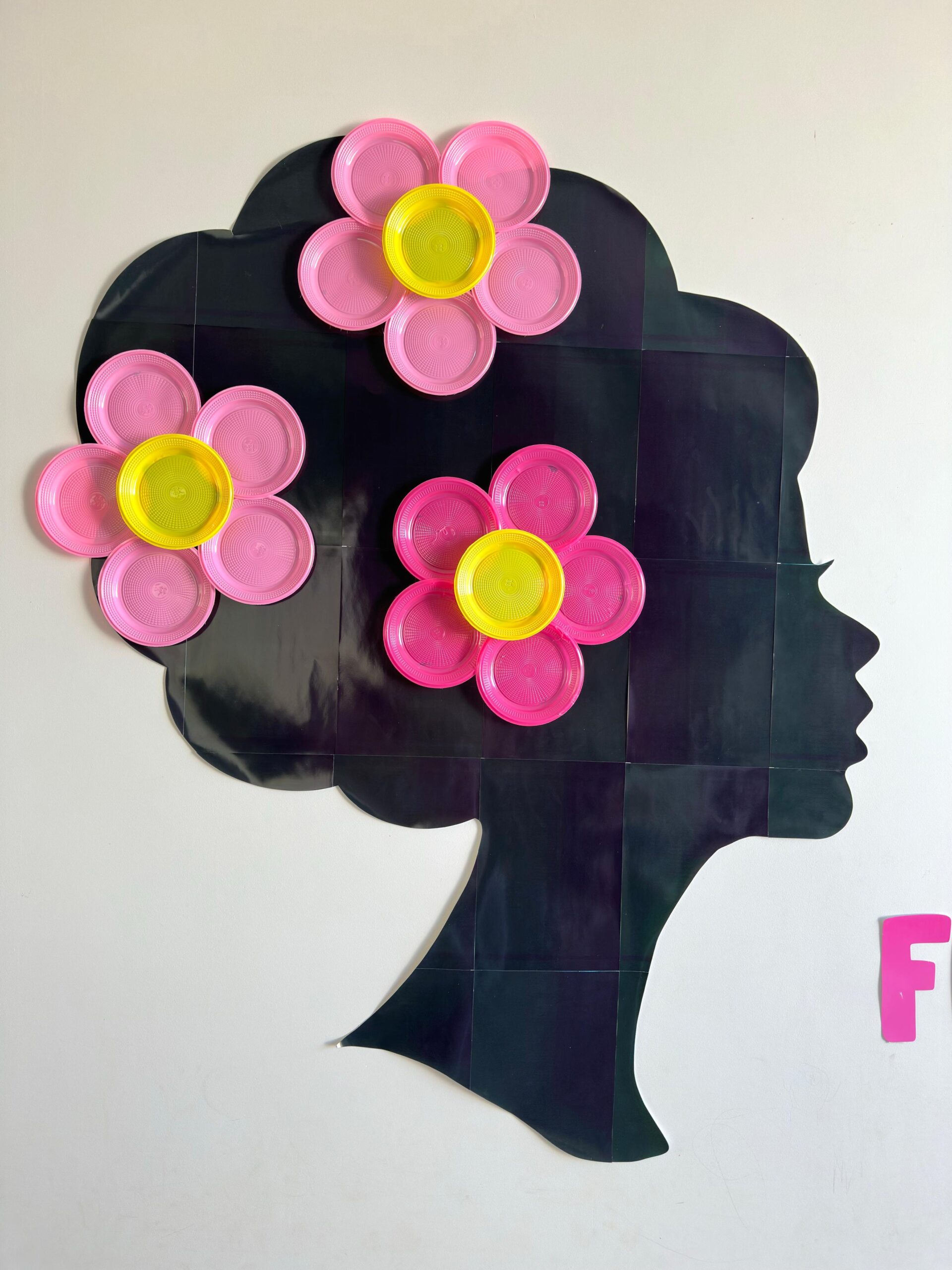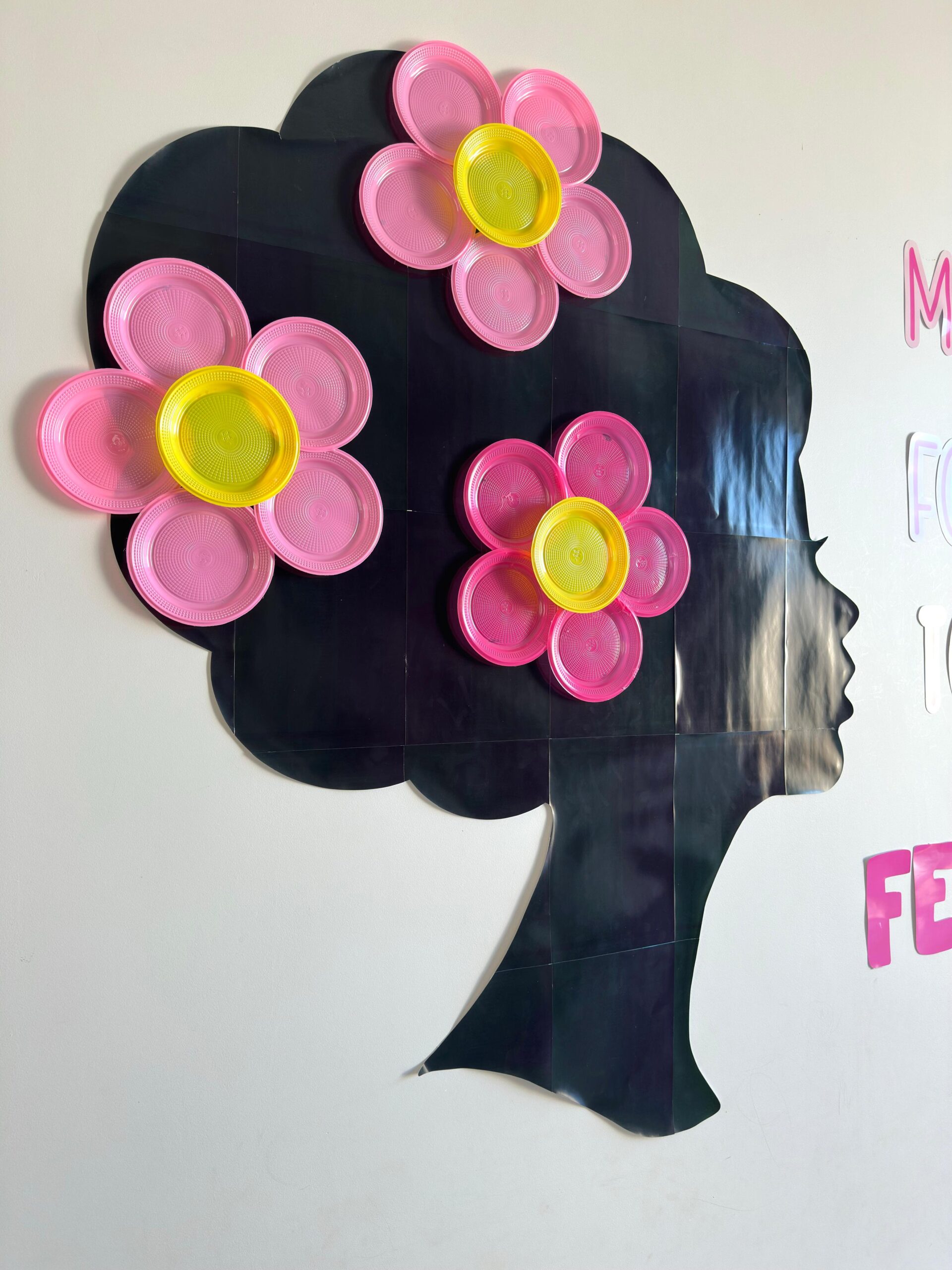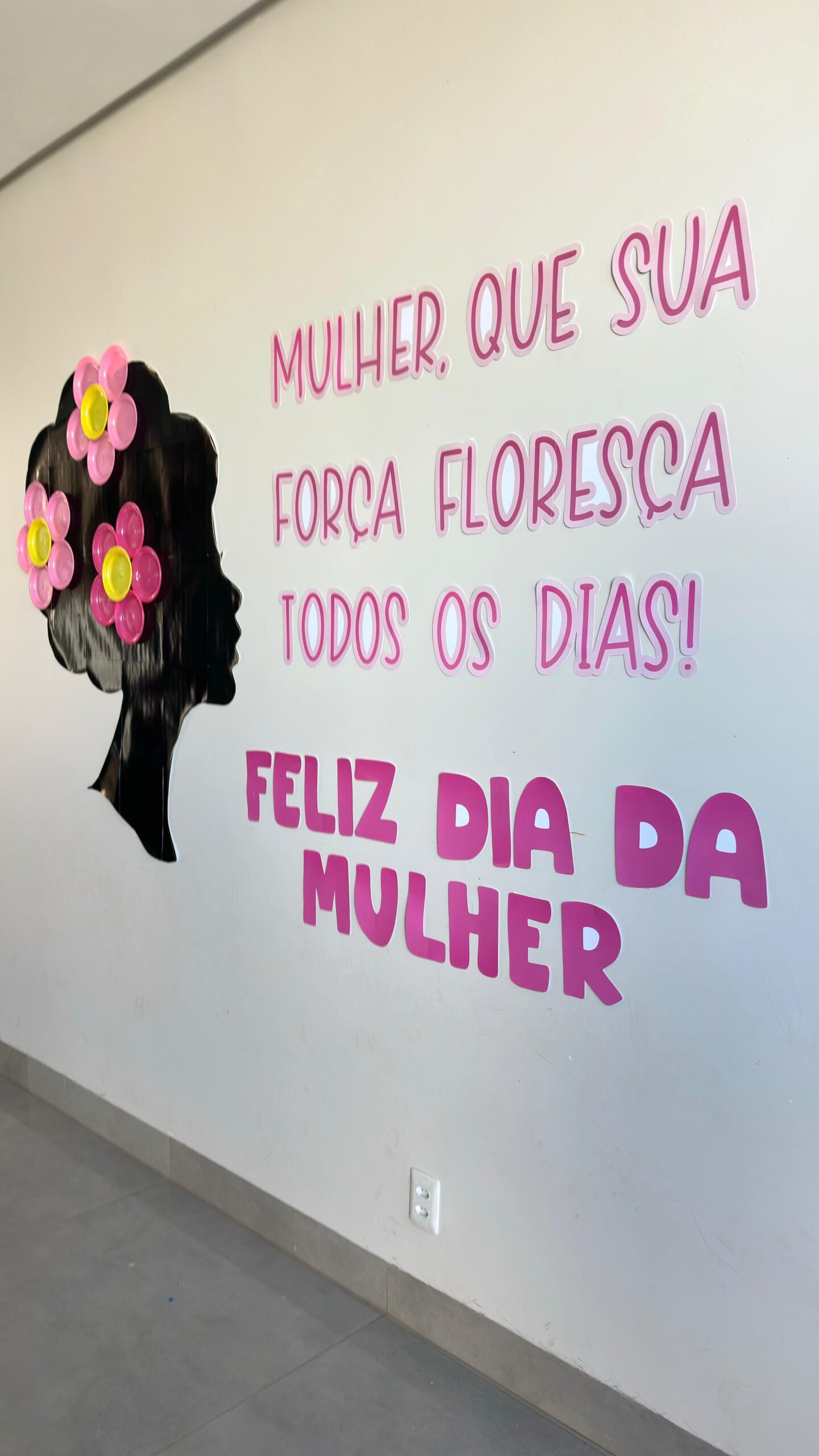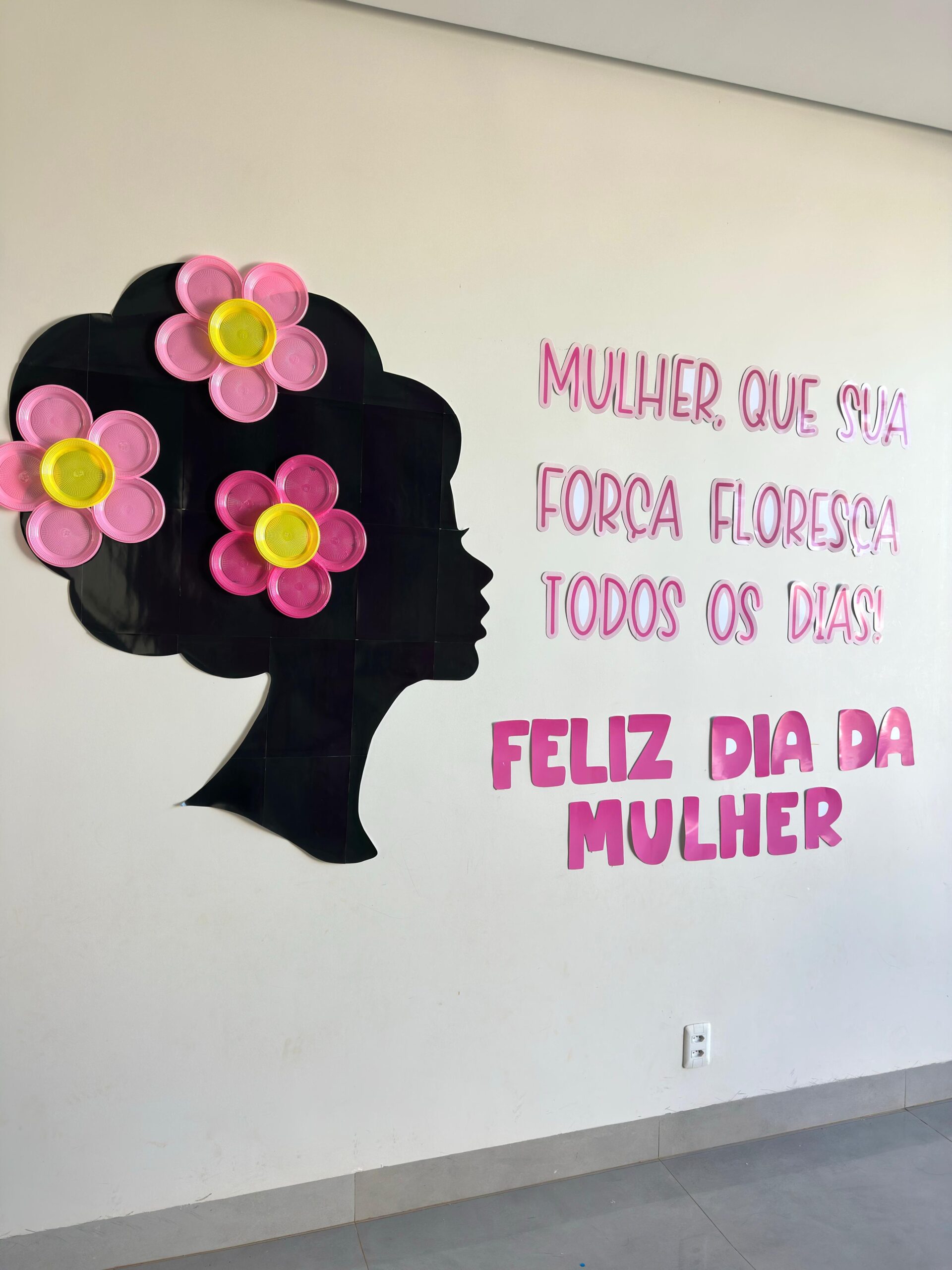 Um painel marcante, delicado e cheio de significado para celebrar o Dia da Mulher de forma criativa e impactante. A arte traz a silhueta elegante de uma mulher em destaque, acompanhada da frase: “Mulher, que sua força floresça todos os dias. Feliz Dia da Mulher.”