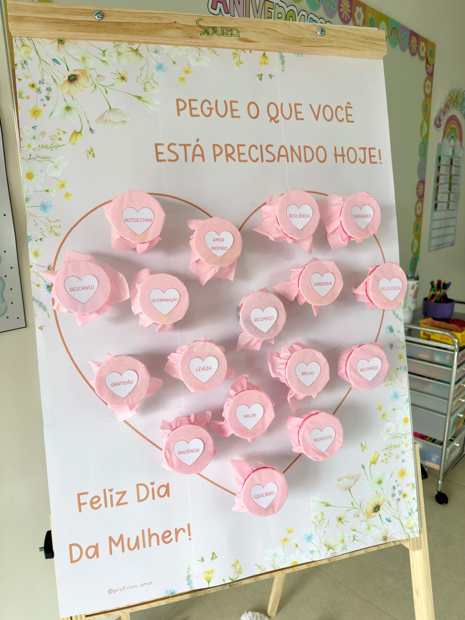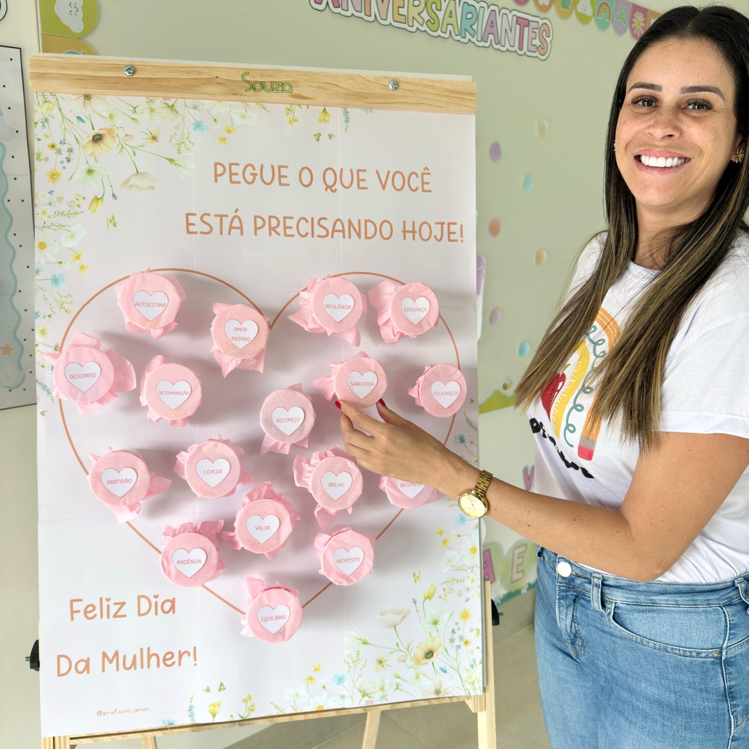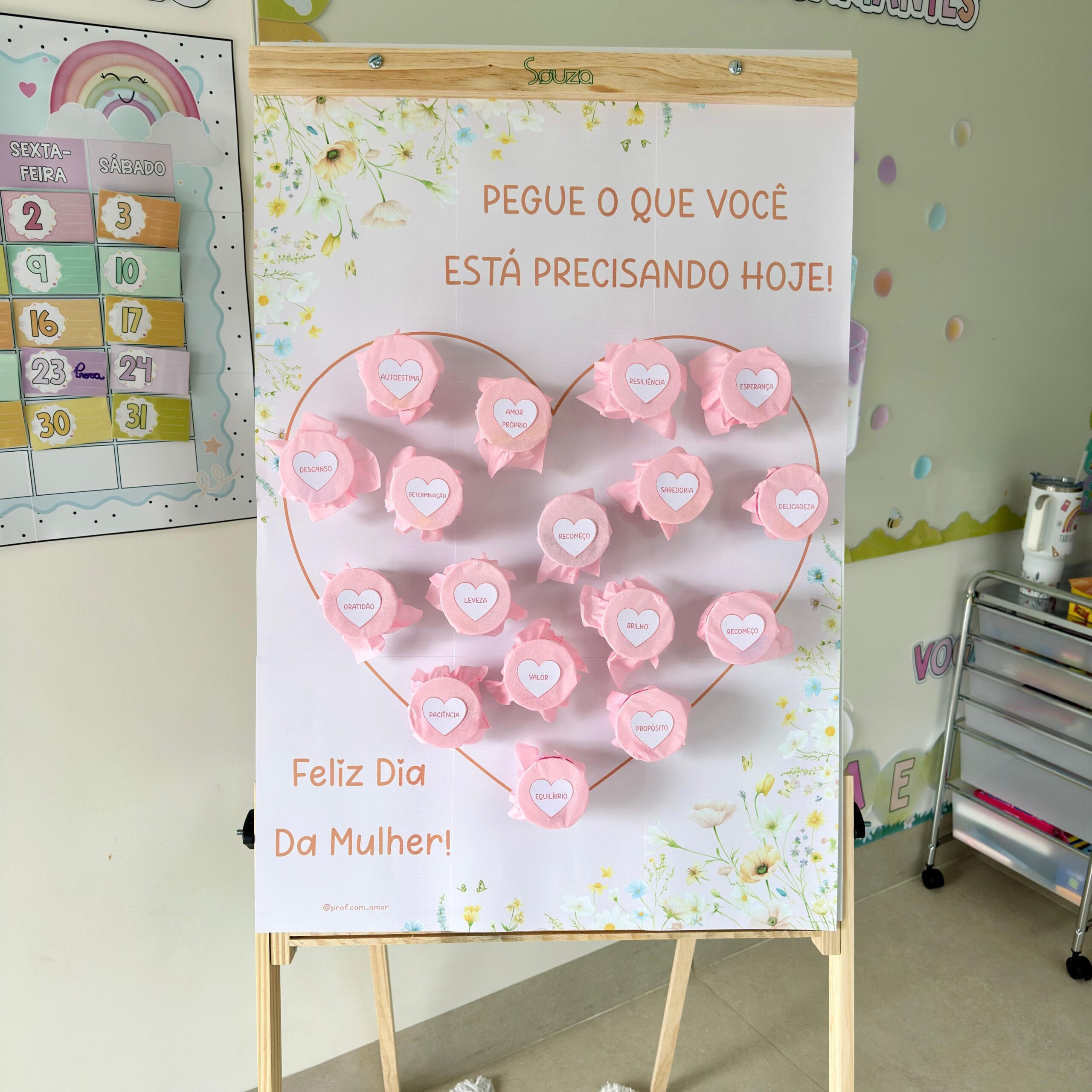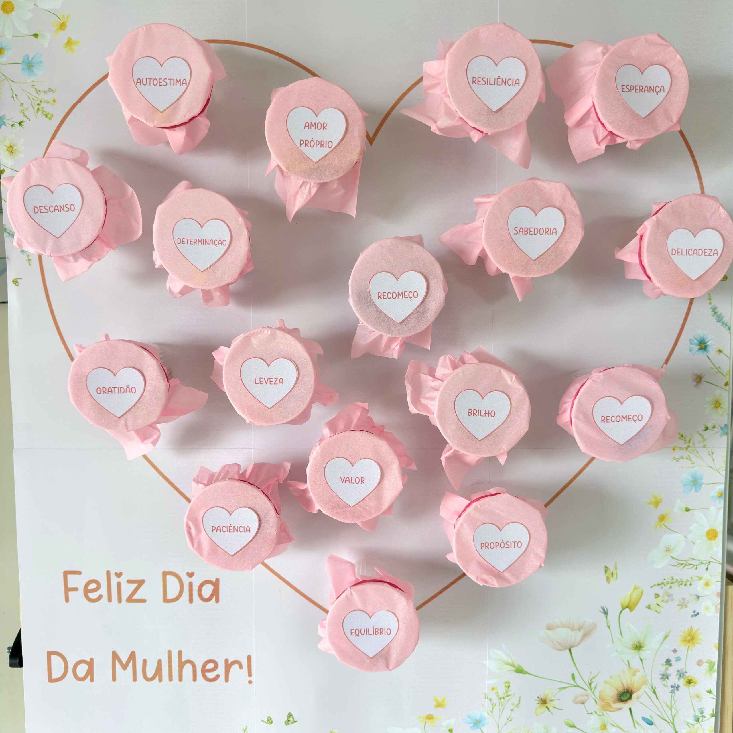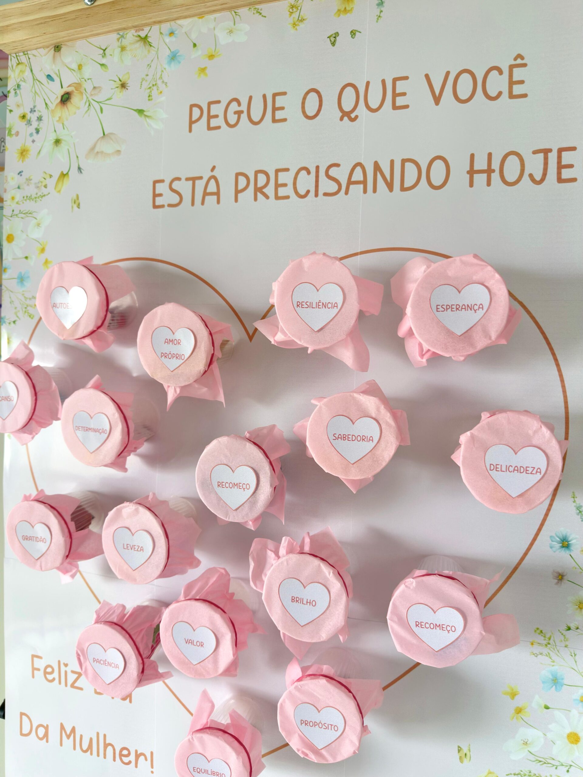 Este painel foi criado para transformar a recepção do Dia das Mulheres em um momento especial e significativo. Com a proposta “Pegue o que você está precisando hoje”, cada mulher escolhe uma palavra, interage com o painel e recebe uma lembrança surpresa.