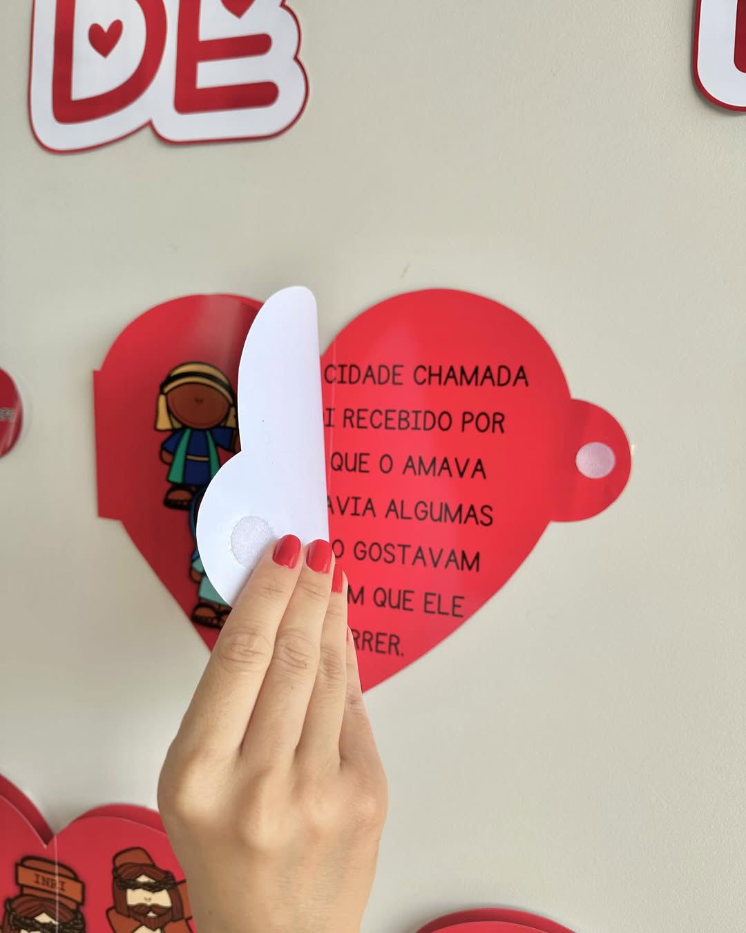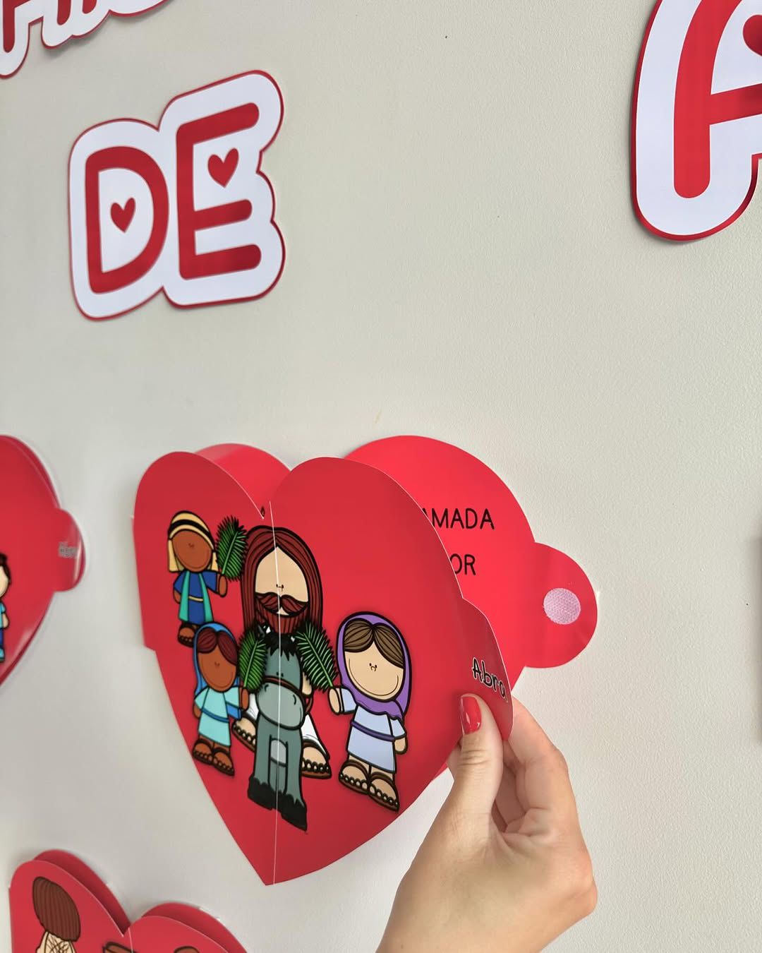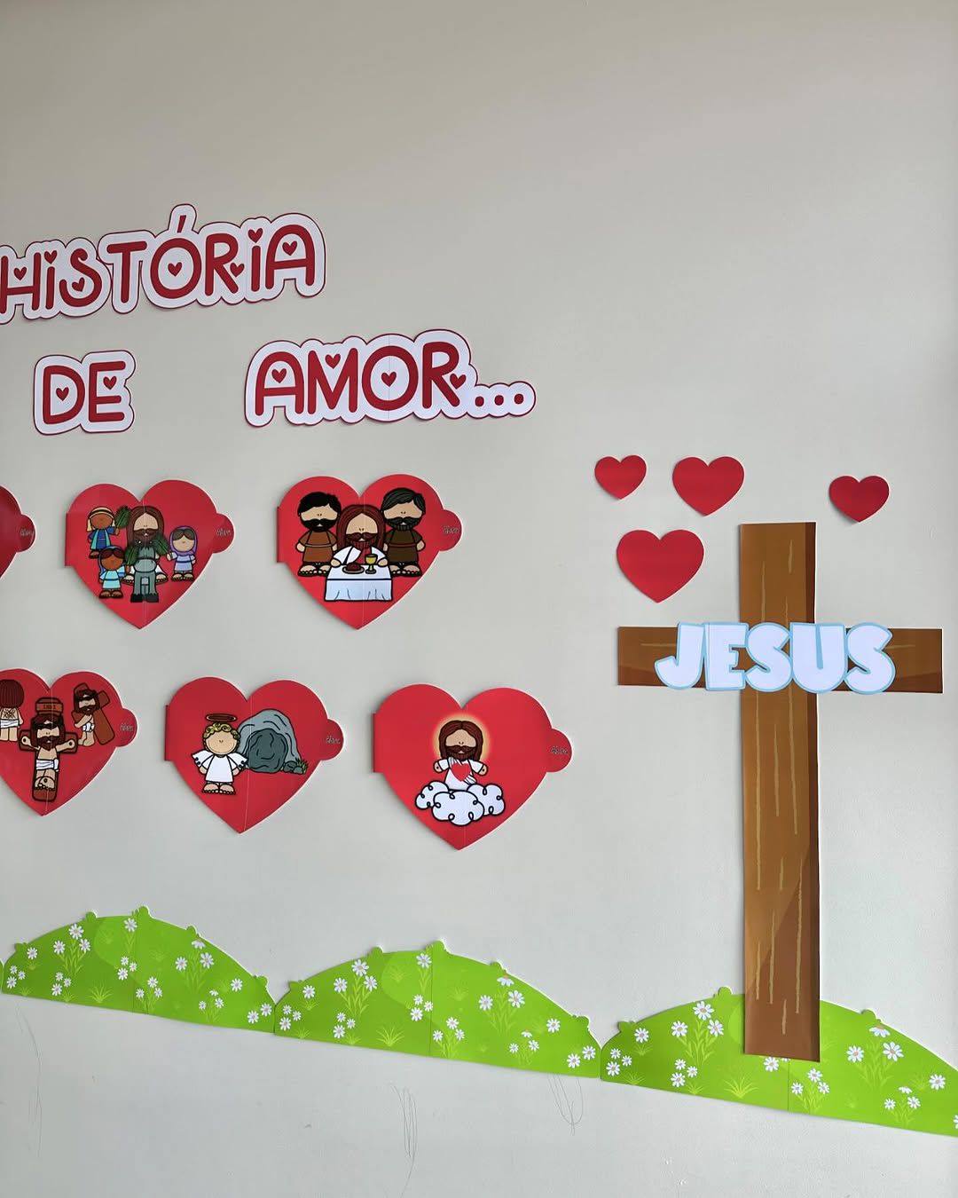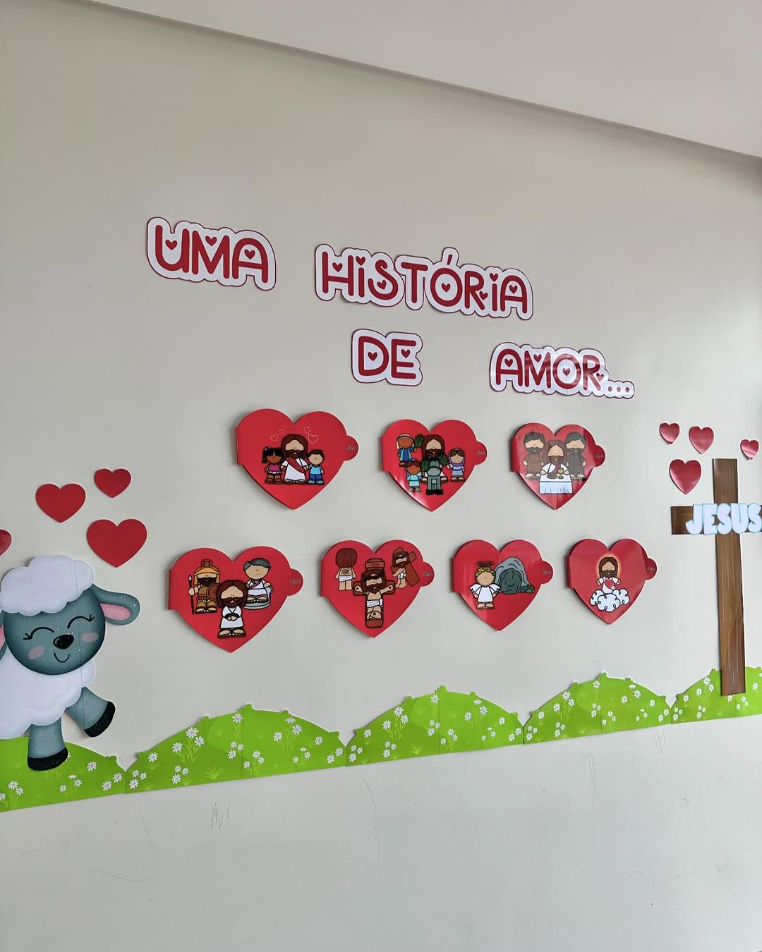 Um painel delicado e significativo com o tema “Uma História de Amor”, representando a trajetória de Jesus por meio de corações ilustrados e sua história contada. Cada elemento transmite amor, cuidado e fé, com cores suaves e detalhes encantadores, criando um cenário acolhedor e cheio de significado para trabalhar valores cristãos com as crianças.