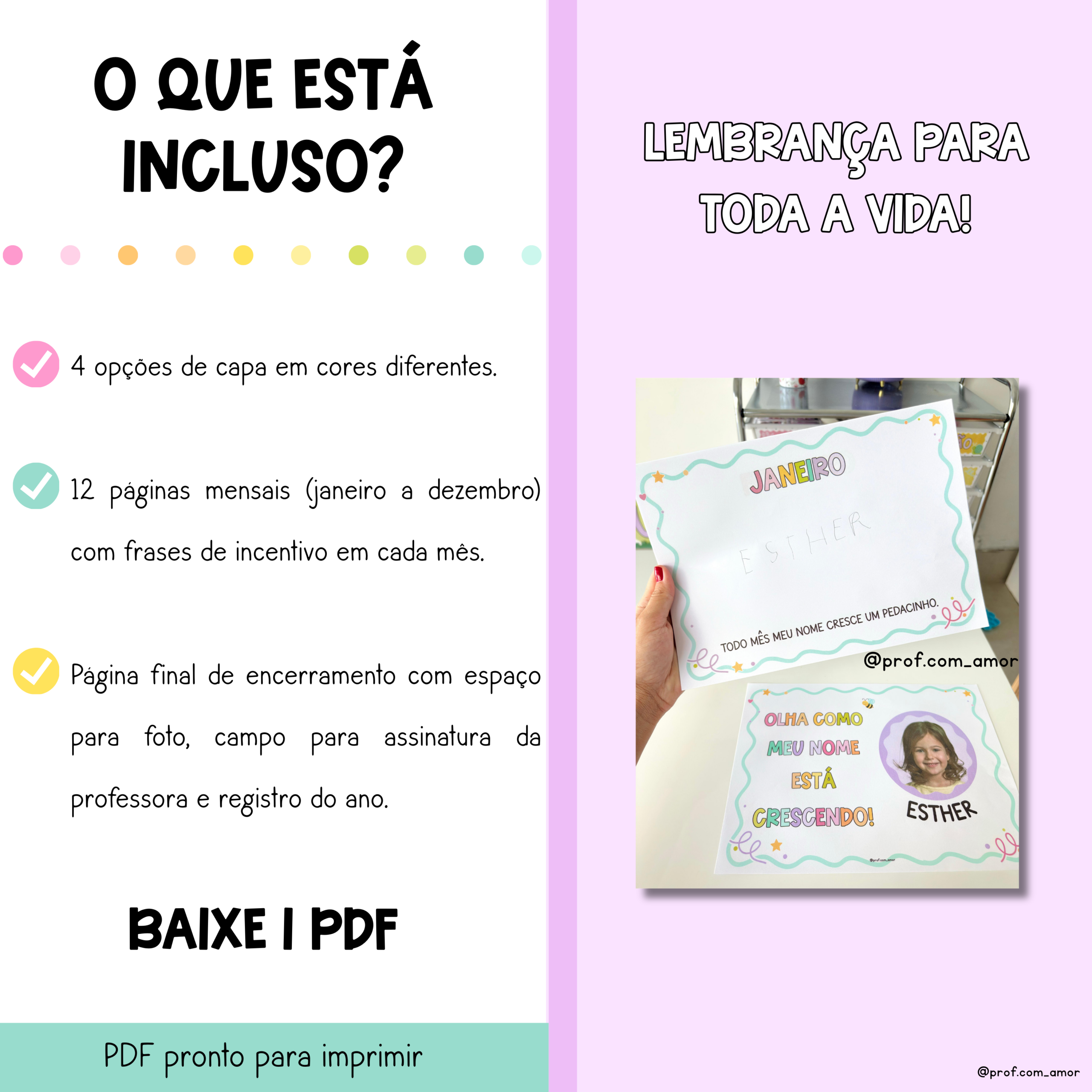 O Registro da Escrita do Nome foi cuidadosamente desenvolvido para acompanhar, de forma sensível e significativa, a evolução da escrita do nome das crianças durante todo o ano letivo.